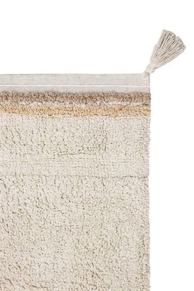 Boyasız doğal iplikle hazırlanmışçocuk odası halısıRugCycled ipliklerimizden dokunmuştur. Kanvas tabanlı altın renkli pamuklu halı, farklı hav yüksekliklerindeki sıraları birleştirerek yüzeye zarif bir yapı kazandırır. Bordürlerde linen ve Naturel kontrast oluşturan iki renkli çizgi ve ardından boş bir kanvas üzerine ince bir işlemeli çizgi ile bezenen halı, köşelerde küçük püsküllerle tamamlanıyor.