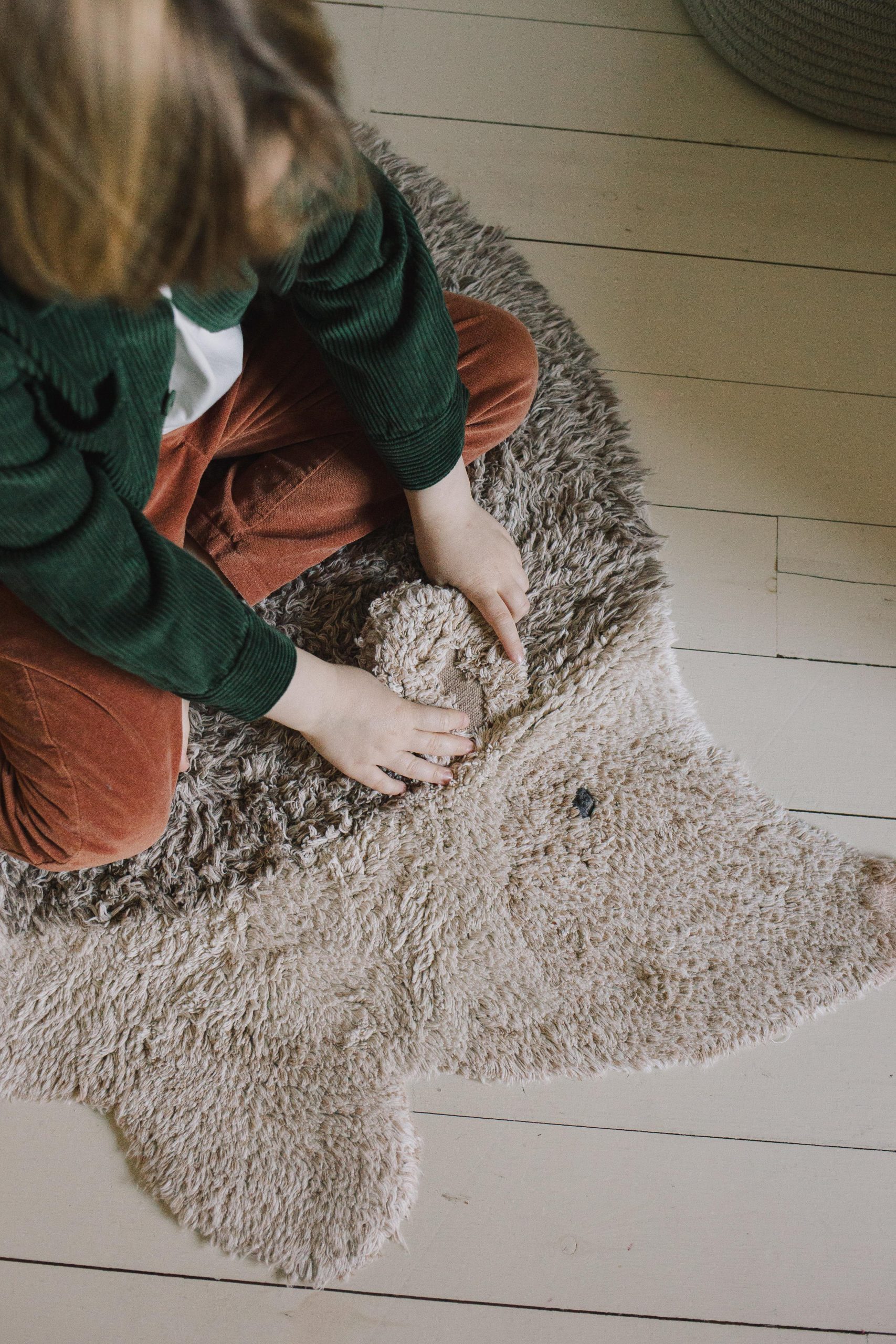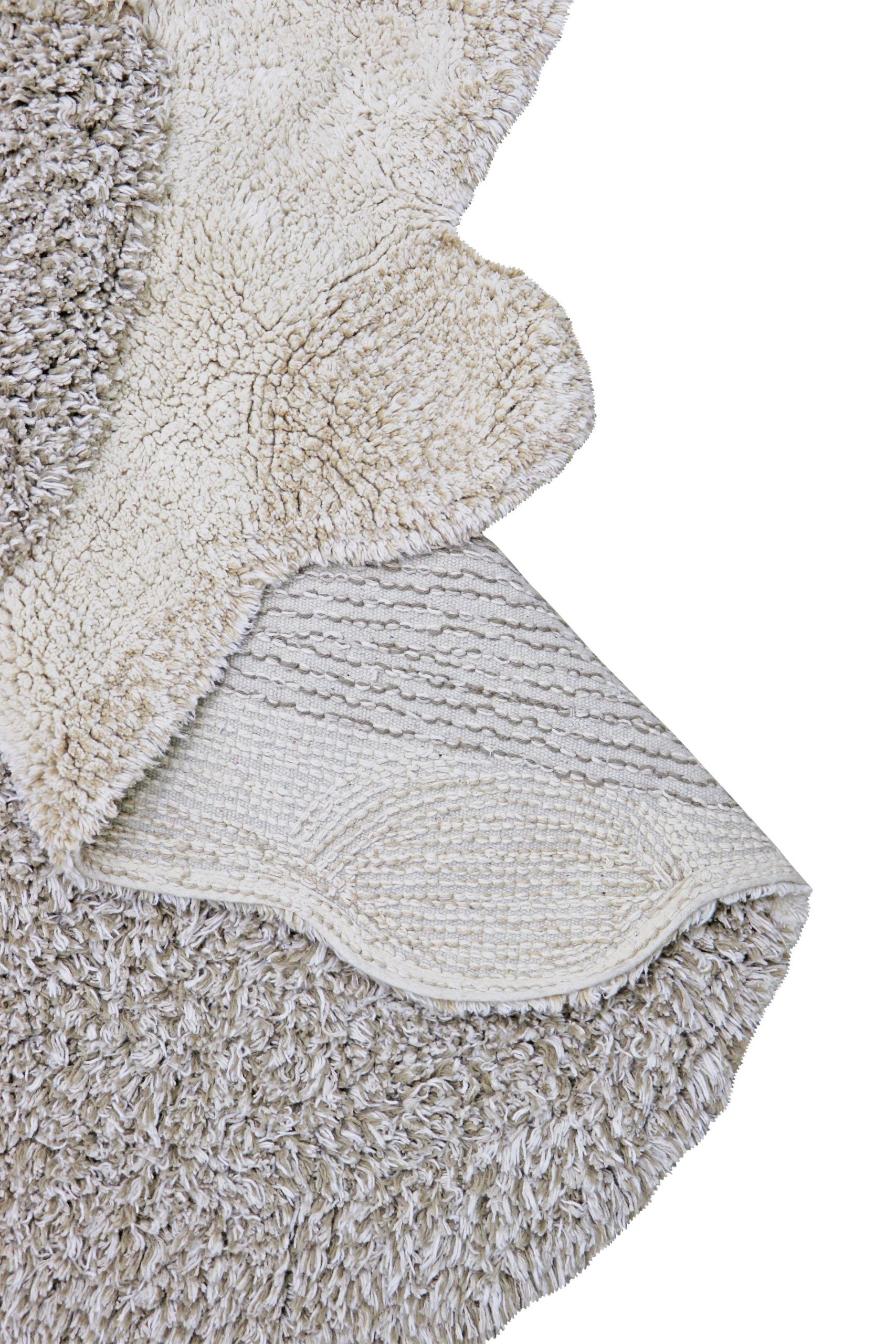Kirpinin tüylerini taklit eden uzun tüylü ve kabarık dokuya sahip, doğal renklerde ve açık kahverengilerde özenle hazırlanmış kirpi şeklinde pamuklu halı.